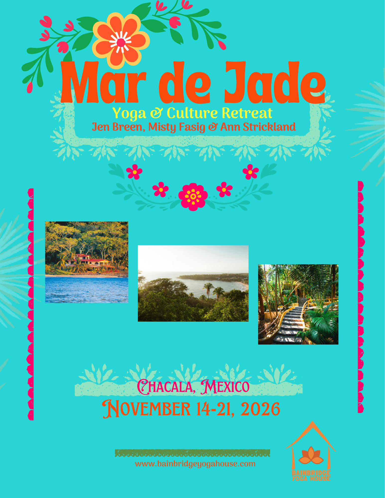 Join Jen, Misty and Ann for a week together of yoga, play, chanting and relaxation at the sweetest place – Mar de Jade – a lovely resort in Chacala, Mexico, nestled in a bay by jungle and sea just an hour and a half North of Puerto Vallarta.